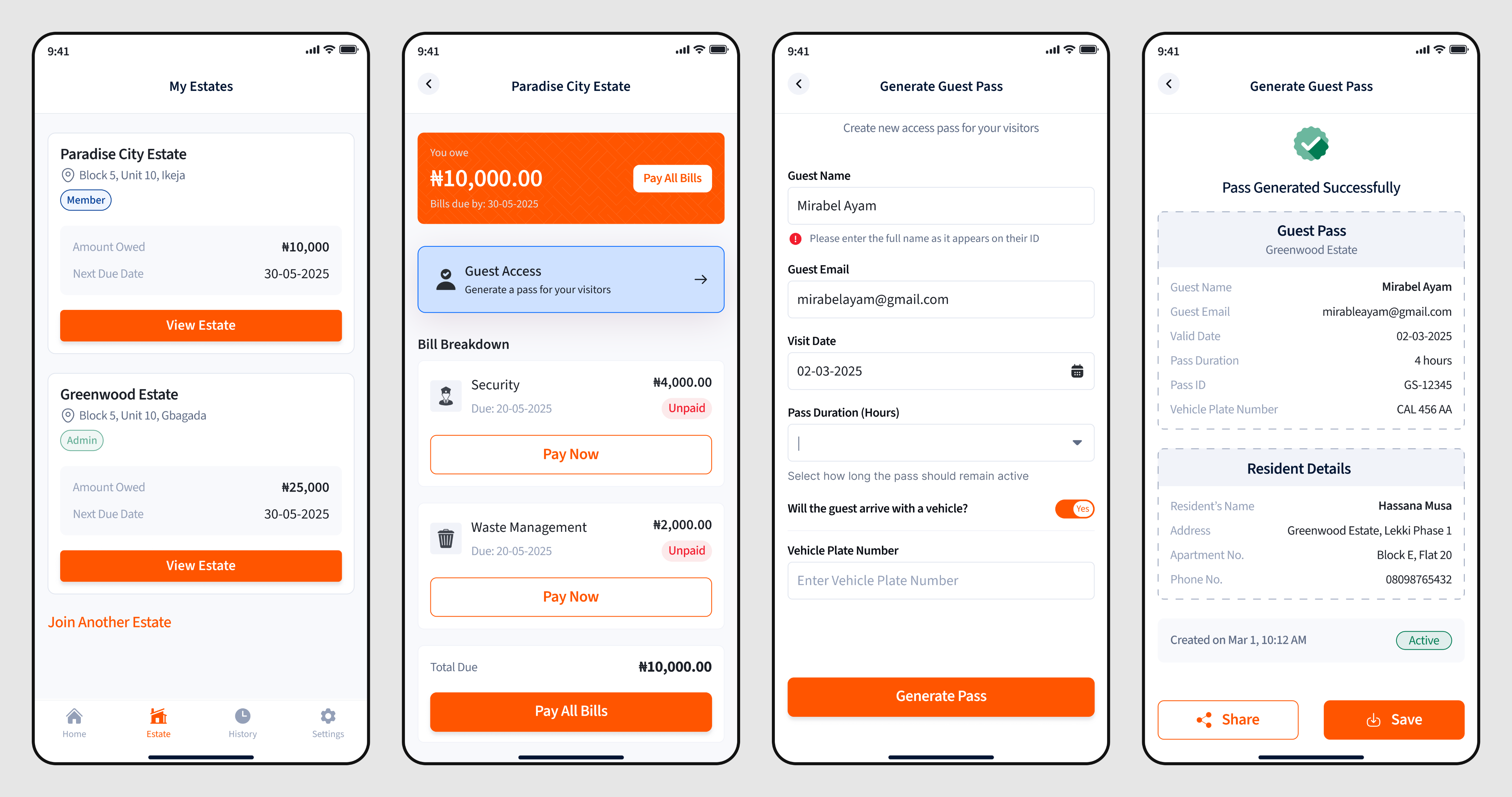 Guest Access Control: Users can generate digital guest passes by entering visitor details (name, email, vehicle plate, visit duration). This improves estate security and visitor tracking.
