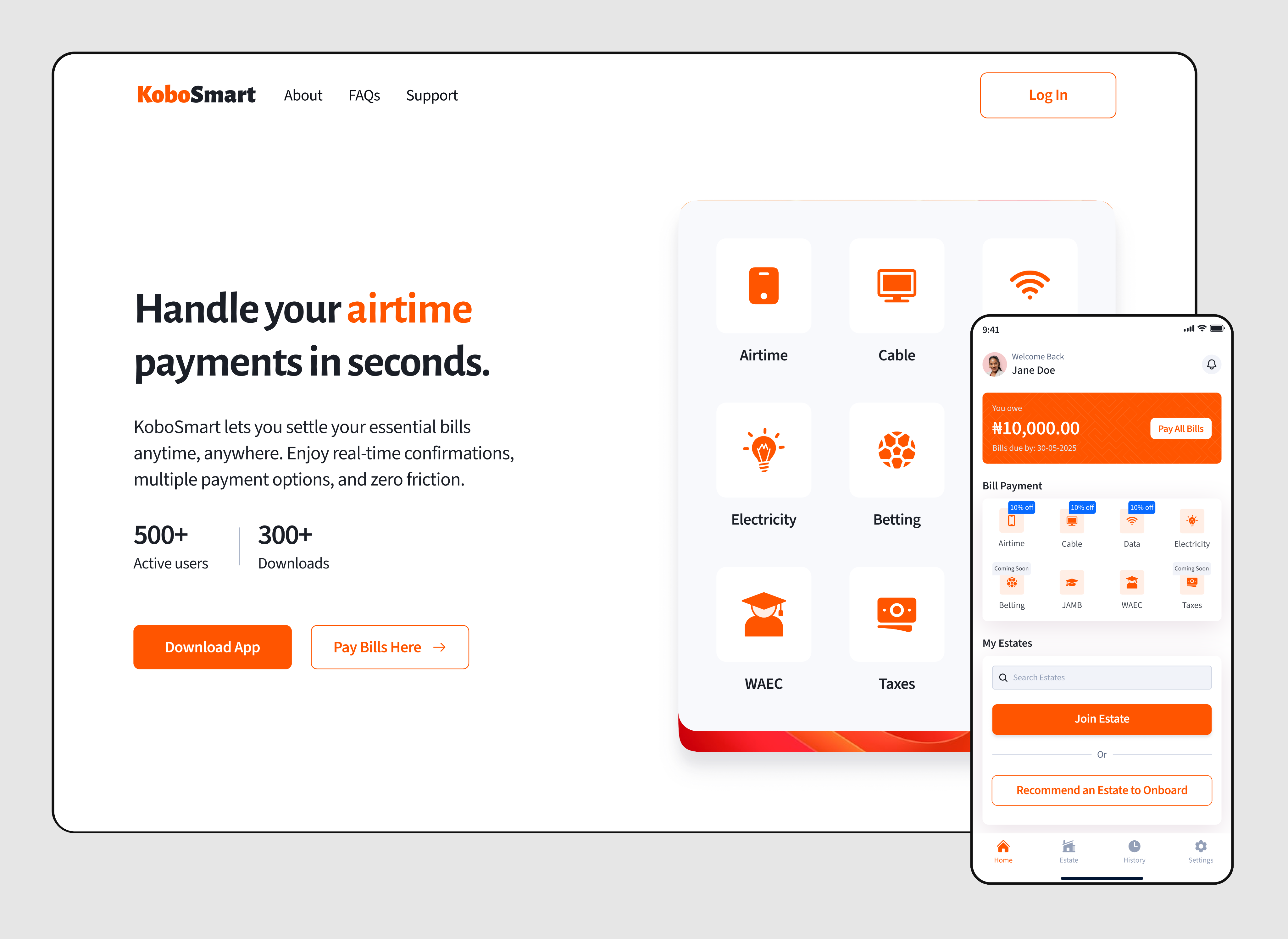 Welcoming Start: A friendly splash screen explains KoboSmart helps you pay bills effortlessly, with clear “Create Account” and “Login” options.