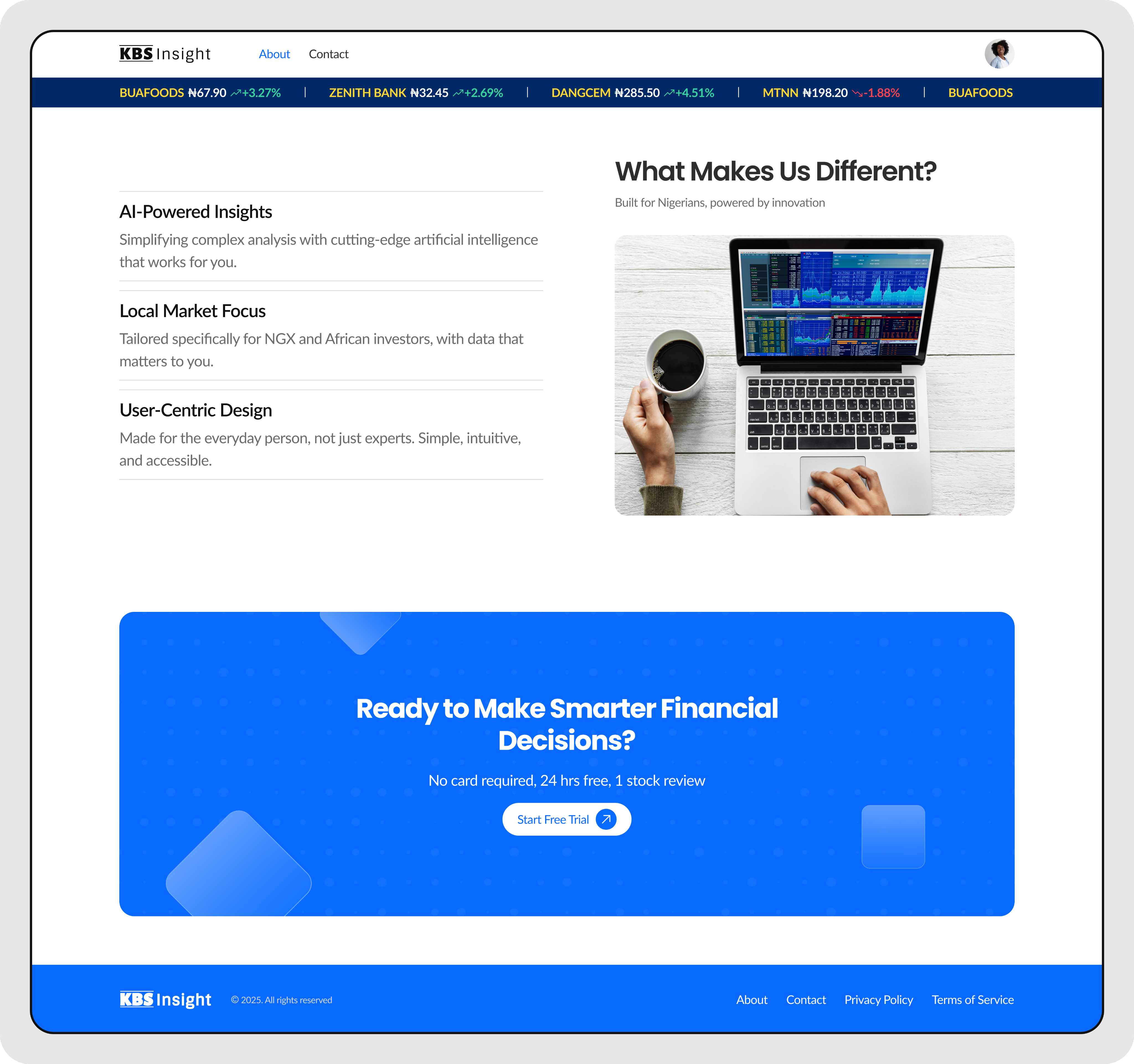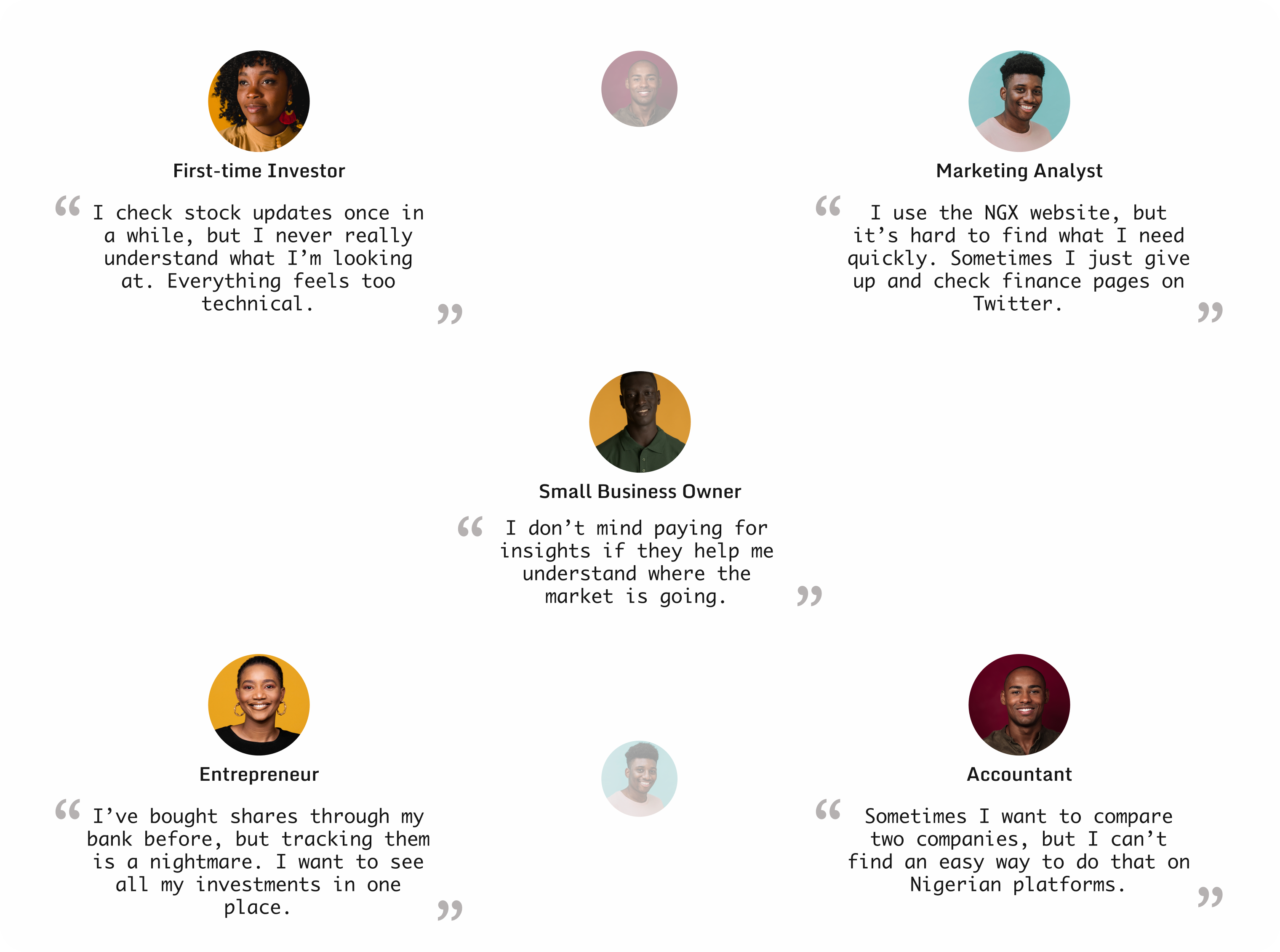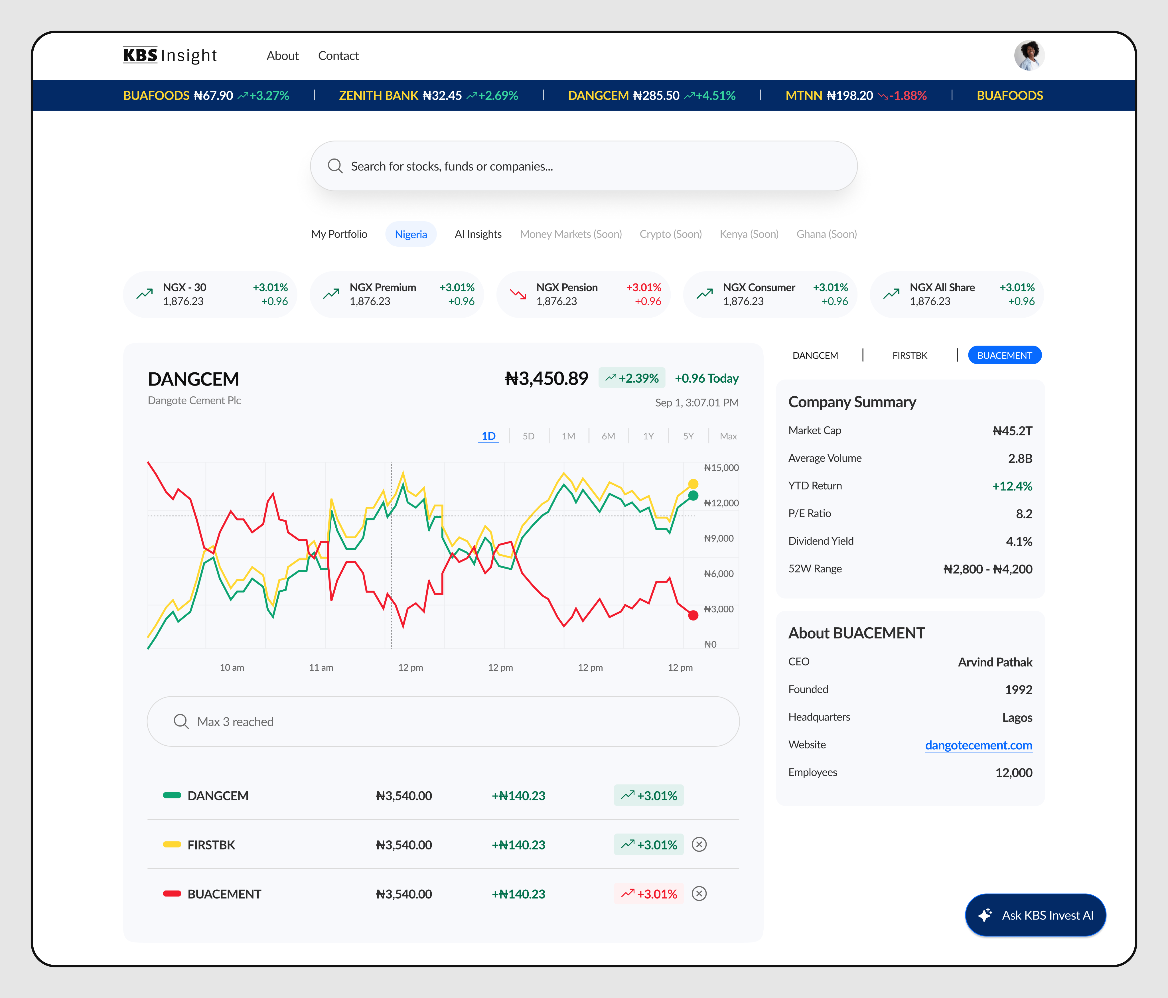 a. Simplified interpretation of data (not just charts and numbers).b. Localized relevance for Nigerian retail users (Naira currency, NGX tickers, familiar UX).c. Engagement tools (portfolio tracking, AI-driven commentary, comparisons) that help demystify investing rather than add complexity.